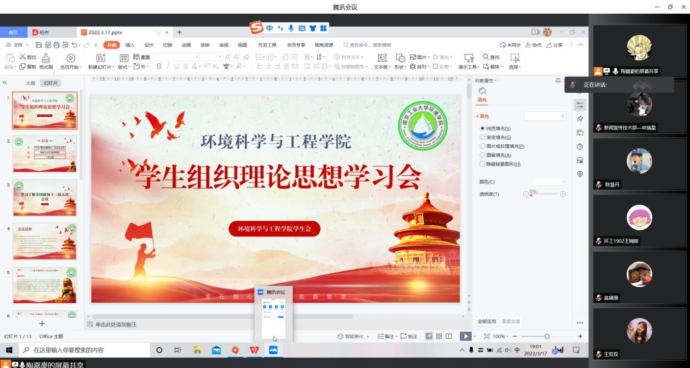 2022年3月18日,太阳成tyc33455cc通过腾讯会议在线上召开了研究生学生会、本科生学生会思想理论学习会。本次会议由主席团、部长团、辩论队以及爱心公益服务队各队长共同参与。