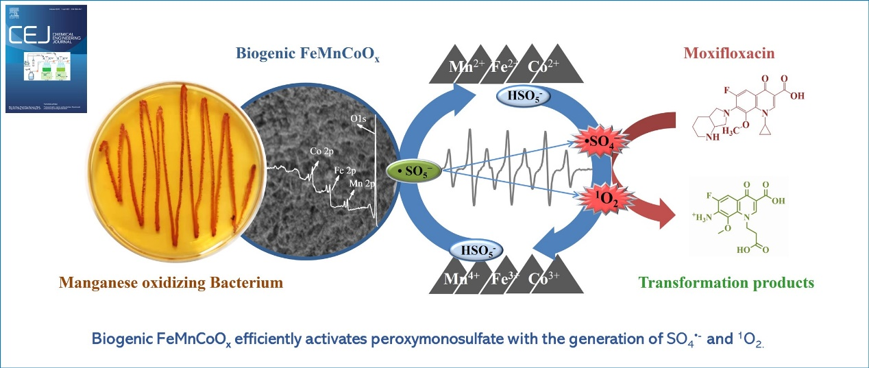 我院张永军教授团队采用微生物法,首次制备了锰钴复合氧化物(Bio-FeMnCoOx),探索了生物培养条件、制备条件、掺杂钴等因素对催化性能的影响,并研究了该材料催化过硫酸盐降解莫西沙星的机理。研究表明,生物制备而成的催化剂为弱结晶材料,具有较大的比表面积和丰富的金属价态,催化活性远高于同类催化剂,产生了大量硫酸根自由基(SO4•-)、和单线态氧(1O2)。该研究结果以“Bio-synthesis of Co-doped FeMnOx and its efficient activation of peroxymonosulfate for the degradation of moxifloxacin”为题,于近期发表在工程类国际著名期刊Chemical Engineering Journal上,我院徐安琳为第一作者。