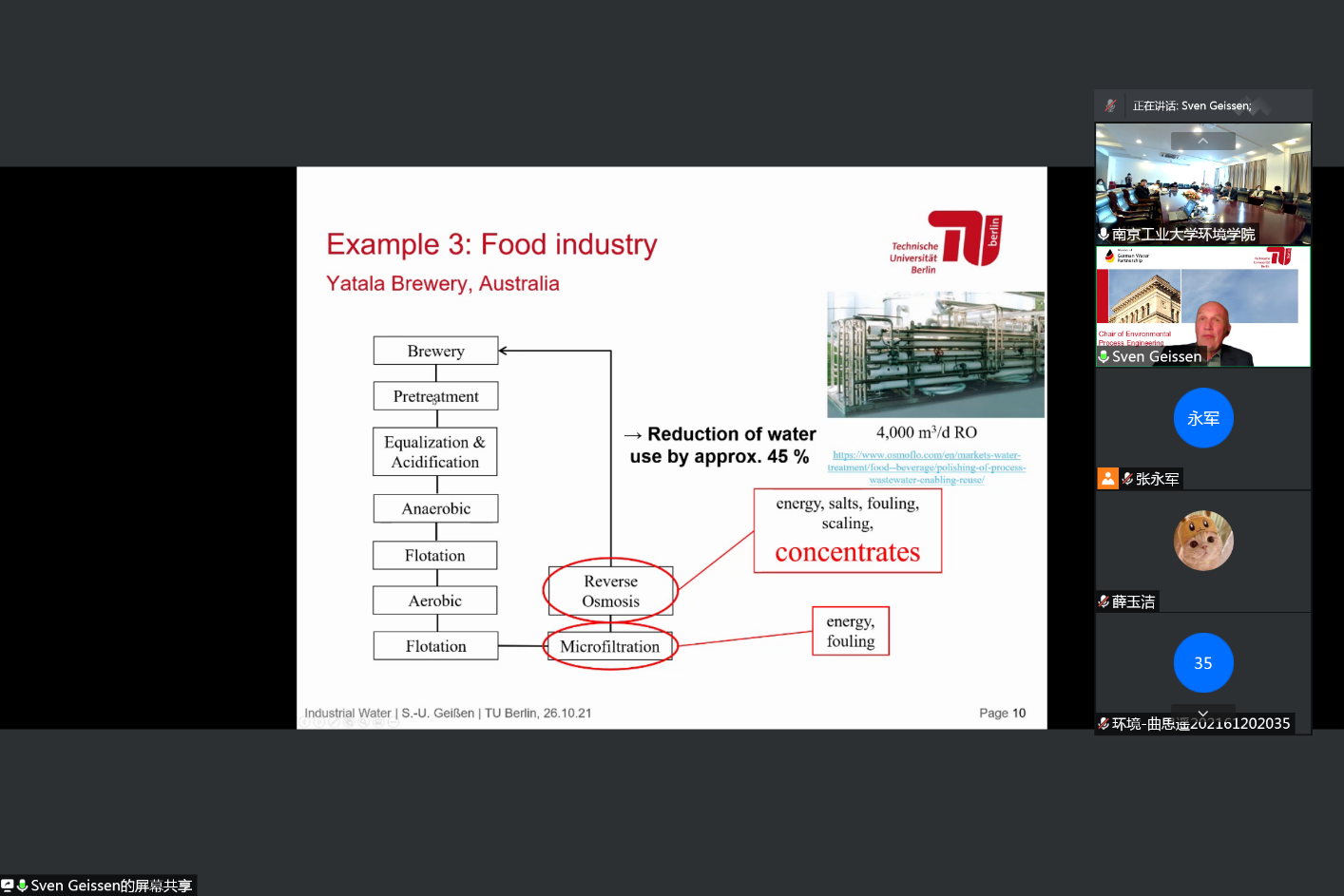 2022年4月8日,德国柏林工业大学Geissen教授应我院张永军教授邀请,以“New developments in wastewater treatment and reuse”为题目,为学院师生在线讲授了工业水处理及回用方面的最新进展。报告中,Geissen教授结合最新环保理念及需求,以多个大型科研项目为例,深入浅出地介绍了工业水及其所含物料和能量的回用技术,介绍了高浓盐水的常用处理方法;与学院师生进行了讨论交流,并欢迎我院师生到他实验室访问交流。