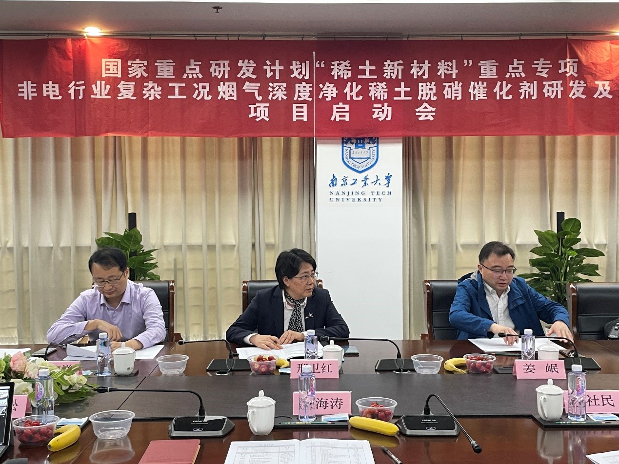 4月26日上午,由我校作为项目牵头单位、徐海涛教授主持的国家重点研发计划“非电行业复杂工况烟气深度净化稀土脱硝催化剂研发及应用”项目启动会暨课题实施方案论证会在南京顺利召开。会议采取线上线下结合的形式,工信部产业发展促进中心项目主管王尧,项目咨询专家组成员中国科学院生态环境研究中心贺泓院士、天津大学沈美庆教授、有研稀土新材料股份有限公司刘荣辉教授级高级工程师、中国稀土学会杨占峰研究员、中国科学院赣江创新研究院廖伍平研究员、中国科学院化学研究所宋卫国研究员、中国人民大学牟天成教授、北京化工大学刘志明教授、南京航空航天大学张丕宏副教授等应邀出席会议并指导。tyc33455cc副校长邢卫红出席并致辞,科研院院长姜岷教授、太阳成tyc33455cc副院长(主持工作)仲兆祥教授、项目团队技术骨干共60余人通过线上和线下参加会议。会议由姜岷教授主持。