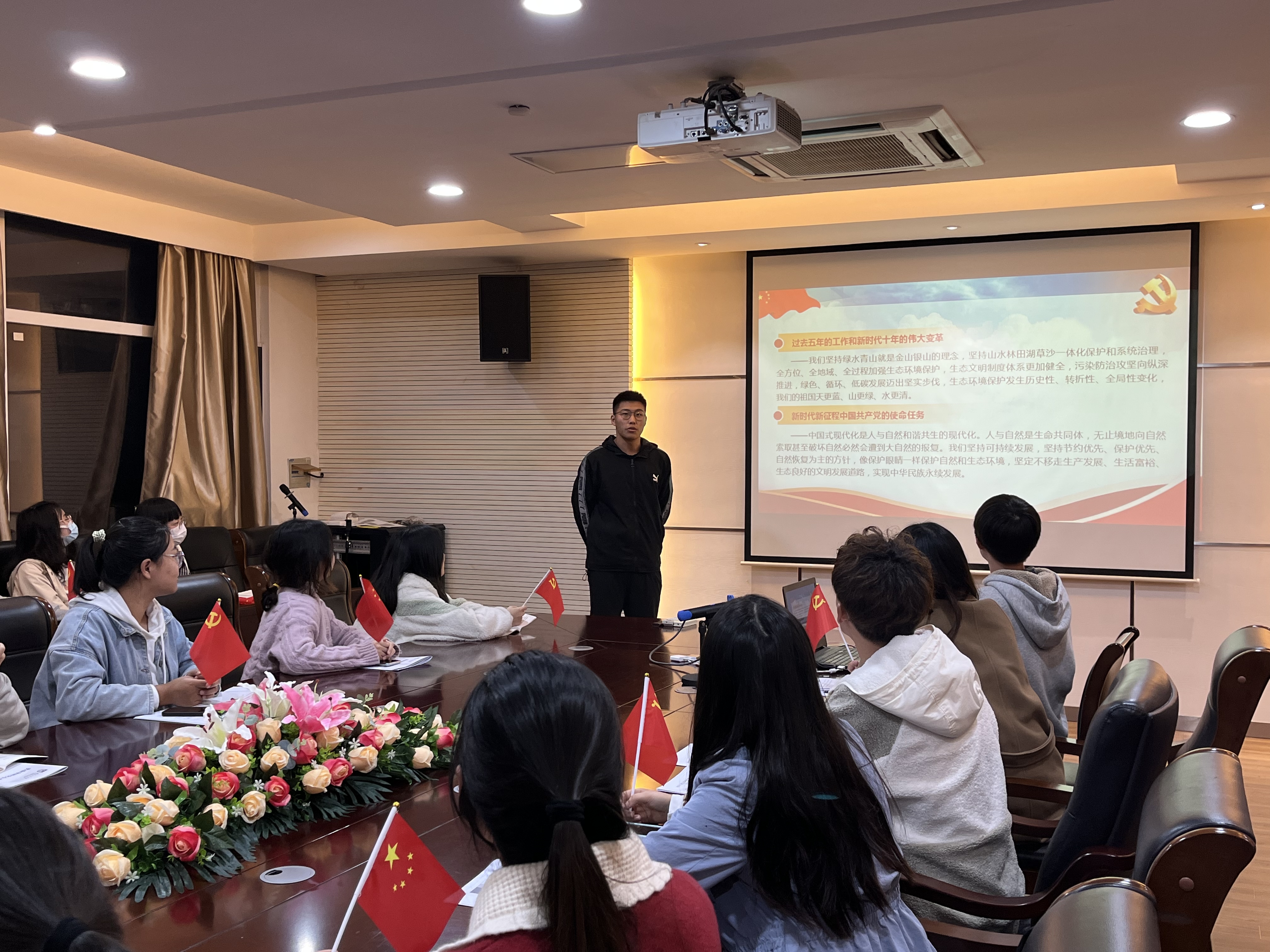 活动的第三部分,支部宣传委员刘新璐作《绿色发展,和谐共生》专题汇报,他结合专业知识分享了自己对人与自然和谐共生的理解与感悟,并呼吁同学们作为环境专业的学子,应担负起时代使命,做生态文明的建设者与推动者。