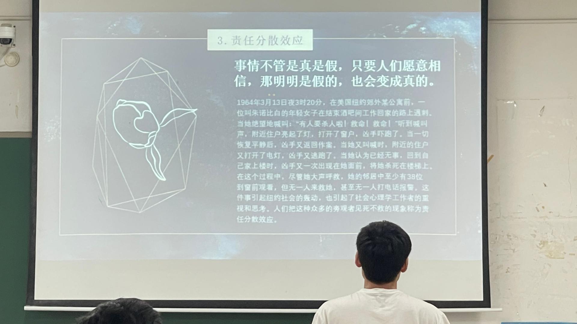 活动前期,志愿者们精心准备了心理学知识微课堂PPT,结合授课内容制作了“不要做大挑战”互动体验趣味卡牌。活动现场,志愿者们通过生动有趣的小故事、小实验对鸟笼逻辑、破窗效应、责任分散效应、帕金森定律、晕轮效应、霍桑效应等常见心理效应进行了阐述和分享,通过案例分享,探讨了这些心理效应给我们什么启示以及在生活中如何具体运用。在体验互动环节,志愿者们带领大家在“不要做大挑战”卡牌中寻找心理效应的影子,同学们互动积极,现场轻松欢快,气氛热烈。