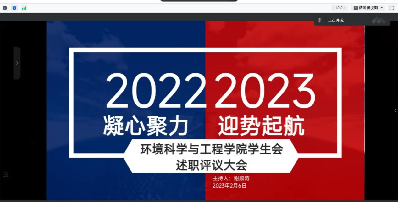 为进一步加强学生组织建设,总结学生会本学期工作情况,2023年2月6日,太阳成tyc33455cc学生会于线上召开2022-2023第一学期述职评议会,学院团委老师、学生会全体工作人员、学生代表共同参与。
