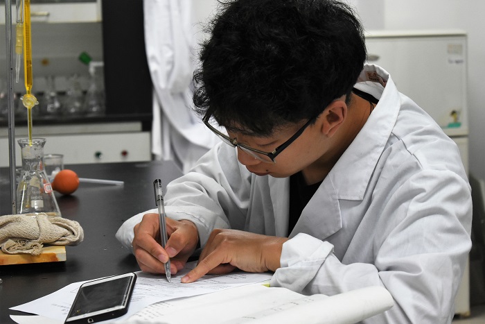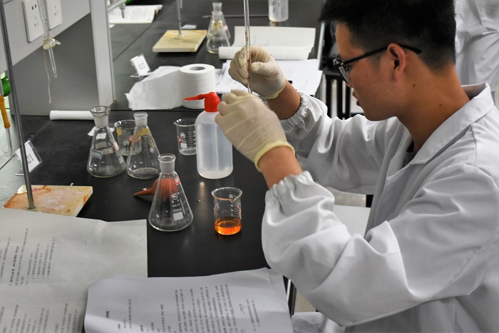 整个比赛分初赛和决赛,分别以笔试和实验操作的形式进行。笔试内容涵盖实验室安全、实验操作基础及环境污染物分析等基础理论知识,经过激烈的角逐,共38名同学入围决赛。决赛内容涵盖水中氨氮、磷酸盐等典型5个水质指标的测定项目,学生现场抽取,计时操作。各评委老师全程参与操作评判,并根据测定结果的准确性、实验操作的规范性、实验结果记录的科学性等整体完成情况进行评判。