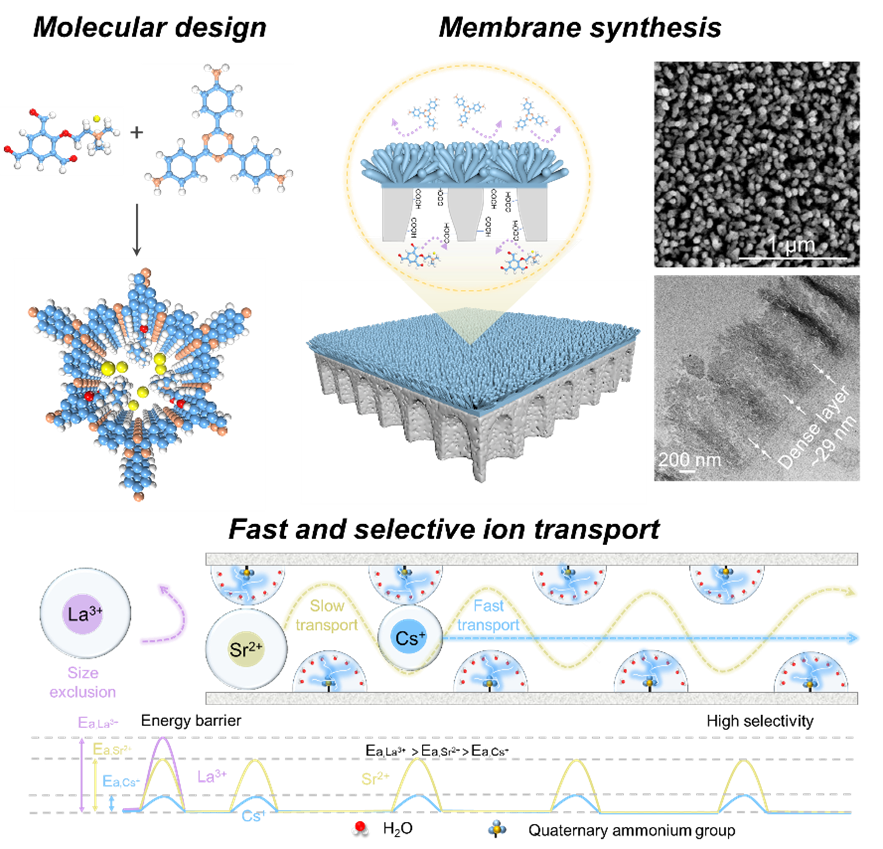 为此,本论文提出采用一类新型的多孔框架材料,共价有机框架(COF)为成膜材料,利用在孔道均一性和孔内化学性质可调方面的突出优势,设计并制备了一种全新的具有非对称结构的COF膜,用于稀有金属离子镧、锶、铯的选择性分离。研究发现,该非对称结构上部为垂直取向的纳米棒,增大了有效接触面积,利于水分子和单价离子的收集;而下部为厚度仅为29 nm的超薄分离层,赋予离子高渗透选择性。该COF膜展现出优异的分离性能,例如超快的铯离子渗透性(0.33 mol m-2h-1),并分别在理想和实际混合体系中展现出高达75.9和69.8的铯/镧选择性。这项工作为稀有金属离子分离膜的设计与制备提供了新思路,有望进一步推动膜分离技术在关键战略资源超常富集和循环再利用方面的应用。