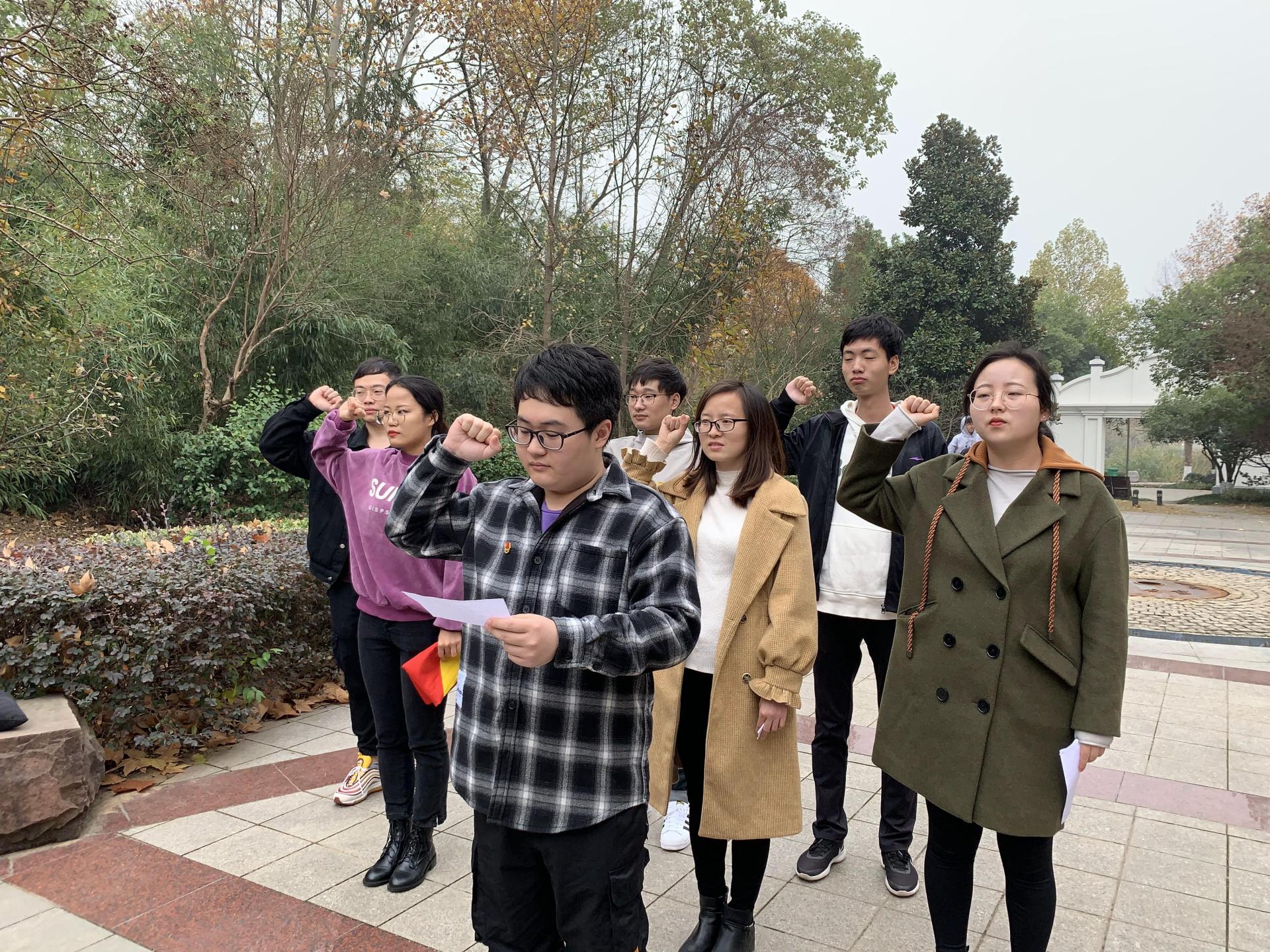 接着,全体成员一同前往校内时筠园“重读入党志愿、重温入党誓词”,支部组织委员张楠担任本次主持。党员们面对鲜红的党旗庄严宣誓,以庄严肃穆的神情和洪亮坚定的声音,表明了为党的事业奋斗终身的坚强决心。稍后,宣传委员梁颖作为党员代表发言,她表示“每一位党员同志必须牢记自己作为一名党员应有的使命和担当”。