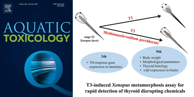 我院生态毒理团队联合中国科学院生态环境研究中心内分泌干扰物与发育毒性研究团队开发出了T3诱导非洲爪蛙变态试验方法(TiXMA),用以快速筛查干扰下丘脑-垂体-甲状腺(HPT)轴以及破坏TH信号通路的TDCs。该试验步骤如下:在1nmol/L T3共暴露情况下,用被测化学品暴露处理52期蝌蚪,暴露24h后检测肠中TH响应基因的表达,以确定测试化学品是否与TR或TH信号中其他因子相互作用干扰TH信号通路;暴露96h后检测体重、形态学终点、脑中基因tshb以及甲状腺细胞组织学,以评估该测试化学品对T3诱导变态发育的影响。该试验使用两种众所周知的TH合成抑制剂甲巯咪唑(MMI)和高氯酸钠(SP)来验证其准确性及敏感性。结果显示,该方法非常可靠,并获得评审专家一致好评。与暴露时长为21天的AMA相比,TiXMA具有暴露时间更短(96h)的显著优势。并且AMA利用发育阶段(DS)和后肢长度(HLL)作为响应终点检测TDCs被实践证明特异性较低;AMA和TiXMA利用形态特征和体重兼以甲状腺组织学作为检测TDCs的重要终点,因为理论上基于甲状腺细胞组织学的阳性结果应该是特定的,但AMA以甲状腺肥大/萎缩、滤泡细胞肥大或增生等甲状腺细胞组织学的改变为指标,但这依赖相关领域的病理学专家经验,对于一般的生态毒理研究人员来说太难,并且往往会产生病理学专家偏见,对实验结果产生影响,而TiXMA使用甲状腺组织胶质面积作为细胞组织指标,该指标很容易被量化,并可以借助图形软件来完成计算,不需要太多的人工分析,普通生态毒理学者也可以做到,并且可以避免组织病理学家依赖性偏见,从而使结果更加准确公正。与XETA相比, TiXMA不但能检测干扰TH信号通路的TDCs而且还能检测干扰HPT轴的TDCs,检测范围更广。